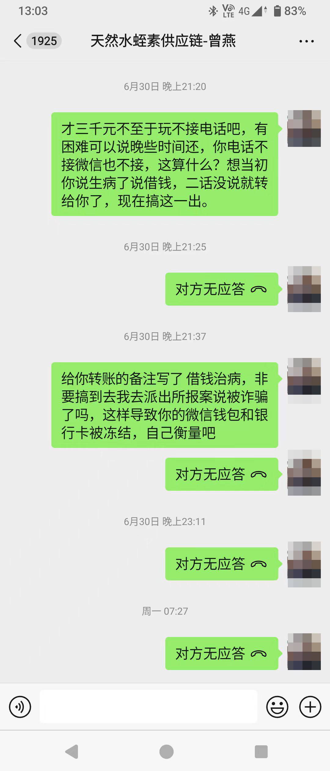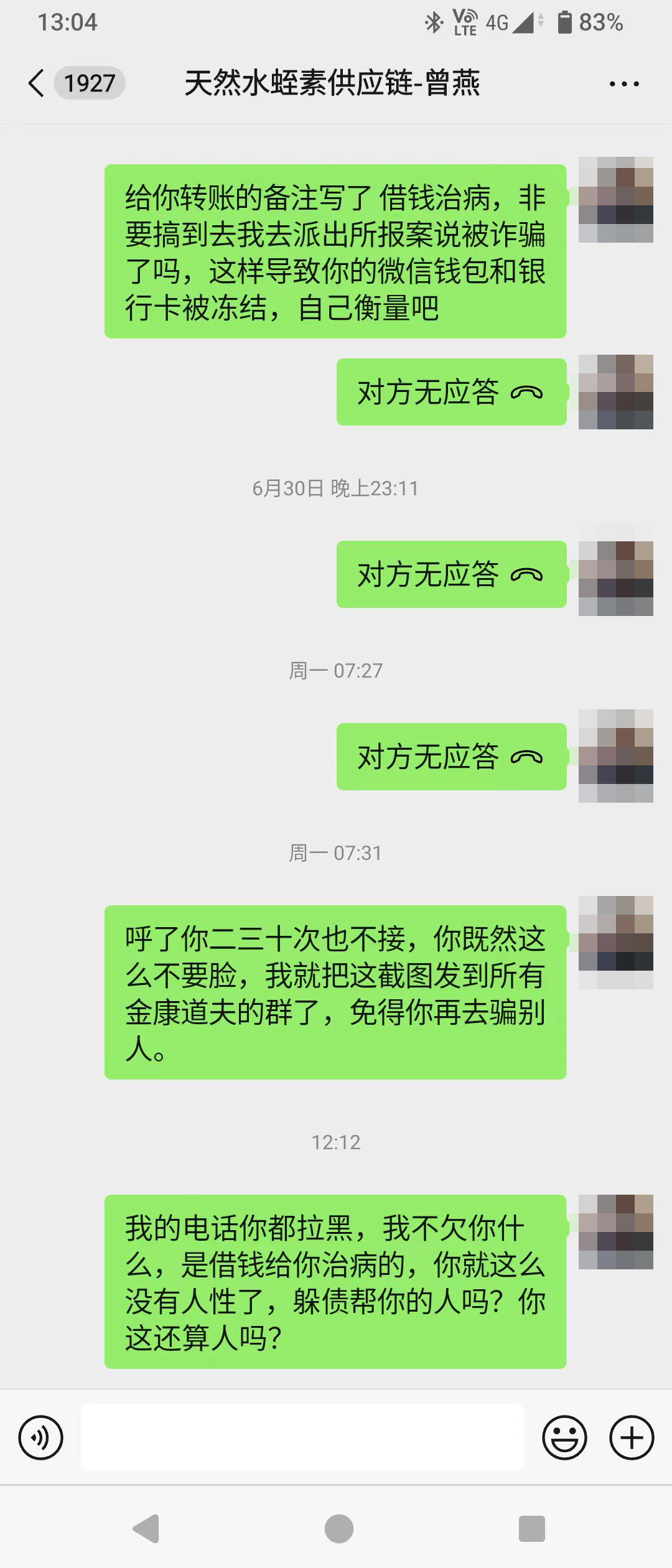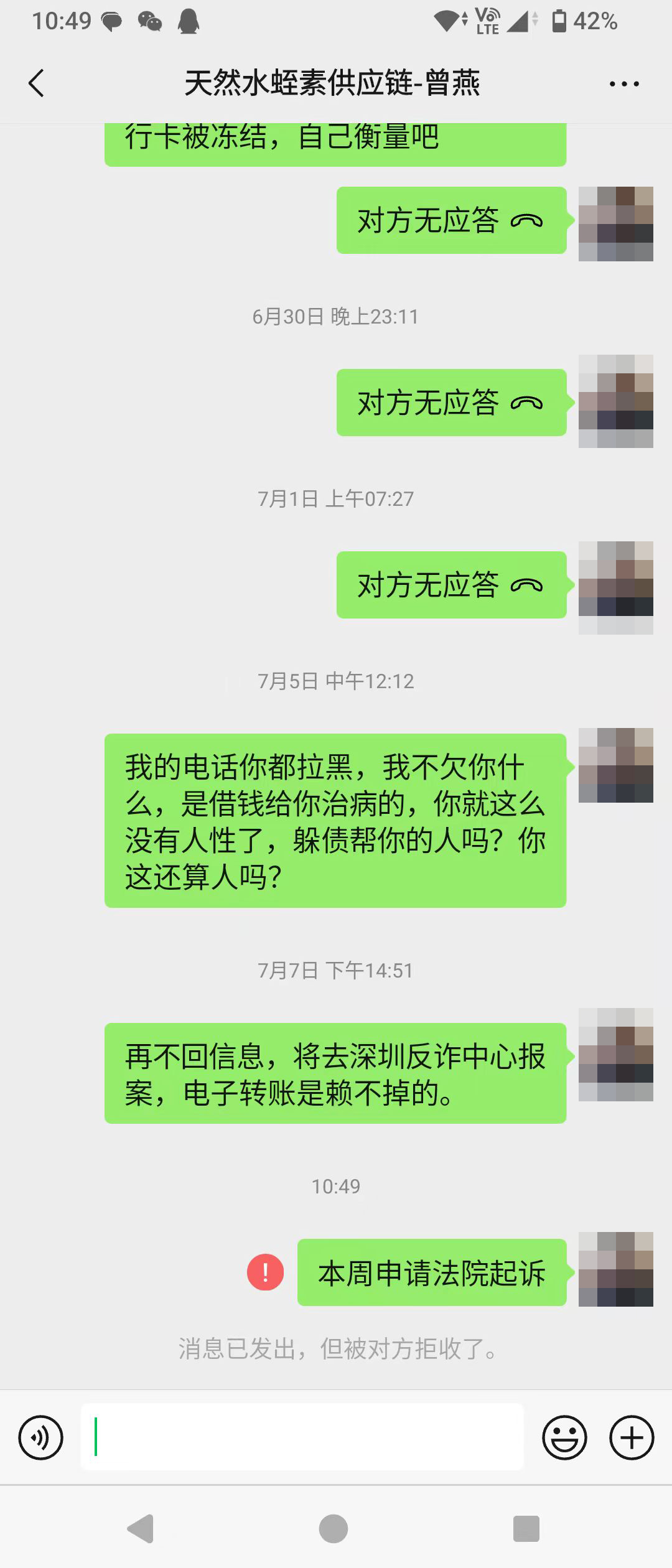 两个多月后多次给曾锦燕发微信,它不回,打它手机它不接。再过了几天发现它全都把我拉黑了,